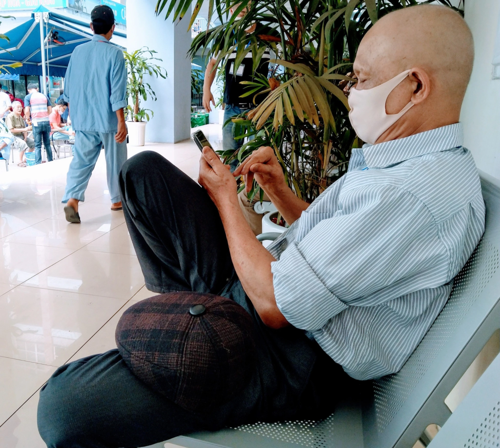 Các ghế dành cho bệnh nhân và người nhà đều chật kín người. Bờ bo vỉa hè dành cho nội thất bệnh viện ấy vậy người nhà và bệnh nhân vẫn cứ tiện dép thay ghế để mông lên ngồi như những đàn chim sẻ buổi sáng bình minh rủ nhau kết bạn. Người nọ kể người từng dãy dài.“