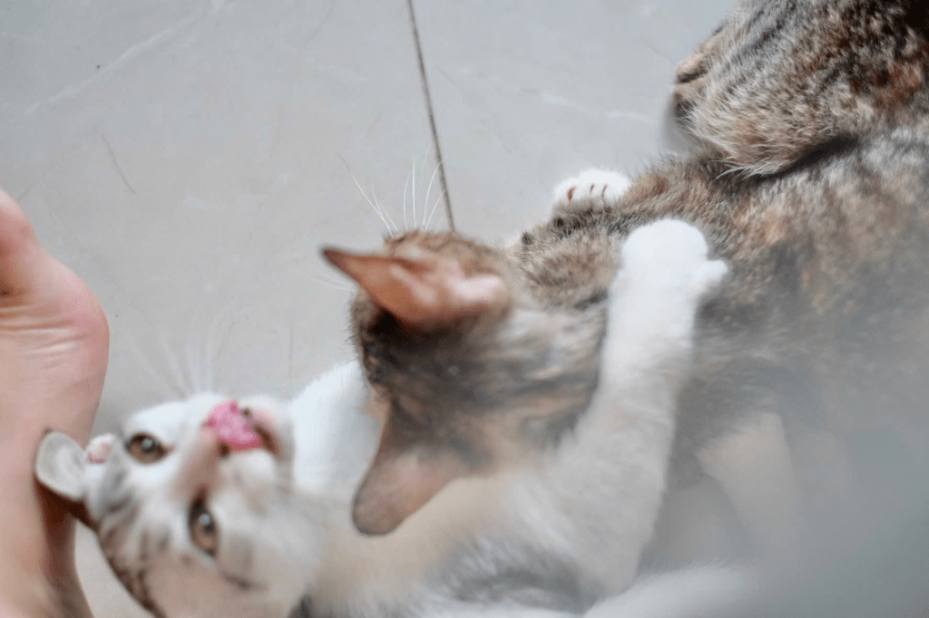 Hơn 8h tối, về tới phòng, mình mới có thời gian ngắm hai mèo lâu hơn, kỹ hơn. Mèo nhỡ màu vằn vện, còi cọc và có mùi lông gà. Mấy bác sĩ ở phòng khám gọi là “Gật Gù” vì em đi như một kẻ say rượu, đi cứ nghênh nghênh cái đầu, nhìn rất khệnh. Mèo nhỏ màu trắng pha tro, người mềm như bánh mochi. Cậu ta đi cũng xiêu vẹo, chắc do mấy mũi khâu sa trực tràng còn đau. Mèo nhỡ vẫn thu lu ngồi trong gầm giường, mở to mắt nhìn. Mèo nhỏ thì phóng như tên lửa, vờn vờn cái thảm xám.